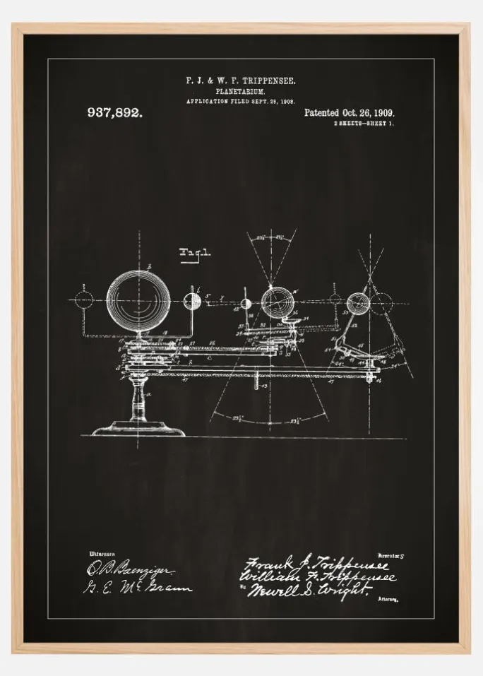 Den nøje udformede patentplakat præsenterer et planetarium, et instrument som banede vejen for studiet af himmellegemernes bevægelser. Patenttegningen viser F. J. & W. F. Trippensee’s design, som blev tildelt patentnummer 937,892 den 26. oktober 1909, efter ansøgning den 28. september 1908. Hver detalje og komponent i konstruktionen er smukt gengivet, hvilket afslører kompleksiteten og præcisionen af dette undervisningshjælpemiddel for astronomi. Det er et fængslende og inspirerende billede for alle med en passion for stjernehimlen og de pædagogiske værktøjer, der er blevet brugt til at udforske den.