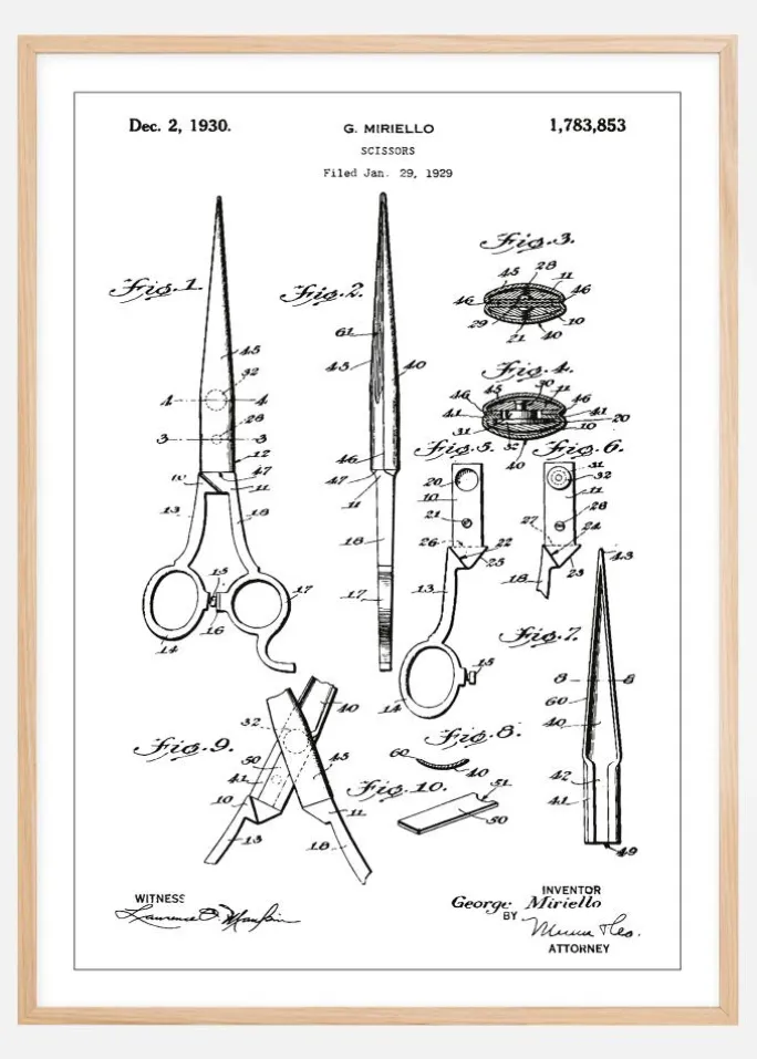 Stilfuld og instruktiv, denne patentplakat afbilder G. Mirellos innovative design af sakse, patenteret den 2. december 1930 under nummer 1,783,853. Det er et pædagogisk indblik i et tidligt 1900-tals værktøjs udvikling, fra de præcisionsskærpede blade til de sirligt udformede skænkler. Hver detalje i patenttegningen er fremstillet med nøjagtighed, hvilket viser den tekniske kunnen og designfærdigheder, der prægede den epokes opfindelser.