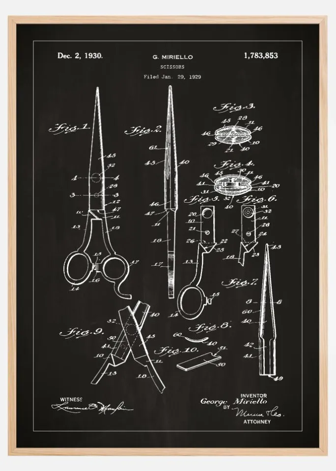 Denne distinkte patentplakat er en hyldest til et klassisk designikon – saksen. Den afbilder G. Mirellos patent, som blev udstedt den 2. december 1930 med patentnummer 1.783.853, efter at være blevet indgivet den 29. januar 1929. Med omhyggelige skitser, der viser forskellige vinkler og dele af saksen, fra de spidse blade til de ergonomisk udformede håndtag, fanger denne patenttegning selve essensen af håndværk og design.