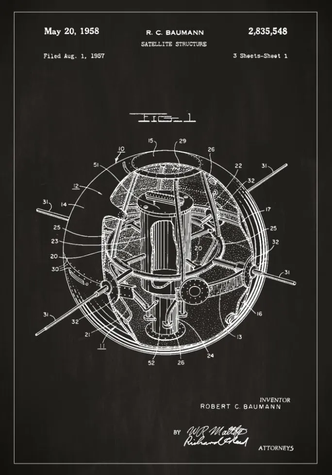 Denne fremtrædende patentplakat afbilder en banebrydende konstruktion i rumteknologiens morgen: R.C. Baumanns “Satellite Structure”, patenteret den 20. maj 1958, med patentnummer 2,835,548. Indsendt den 1. august 1957, viser denne detaljerede patentegradering en tidlig model af en kunstig satellit, komplet med dens komponenter og unikke geometriske konfigurationer, hvilket afslører den innovative ånd under rumkapløbets æra.