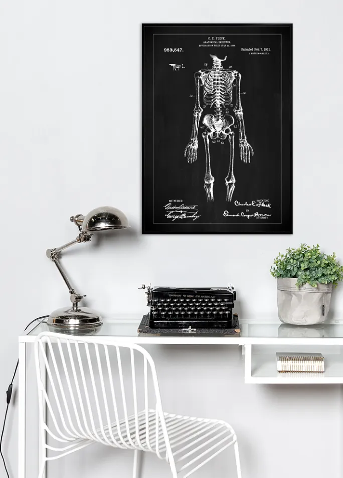 Denne fascinerende patentplakat fremviser patentnummer 983.547, givet til C. E. Fleck den 7. februar 1911, for en anatomisk korrekt model af et skelet. Hvert ben og struktur er dygtigt indgraveret med hvide linjer mod en slående sort baggrund, hvilket resulterer i en visuel oplevelse, der er både pædagogisk og kunstnerisk. Det er en spektakulær illustration, der demonstrerer menneskekroppens vidundere og kompleksitet.
