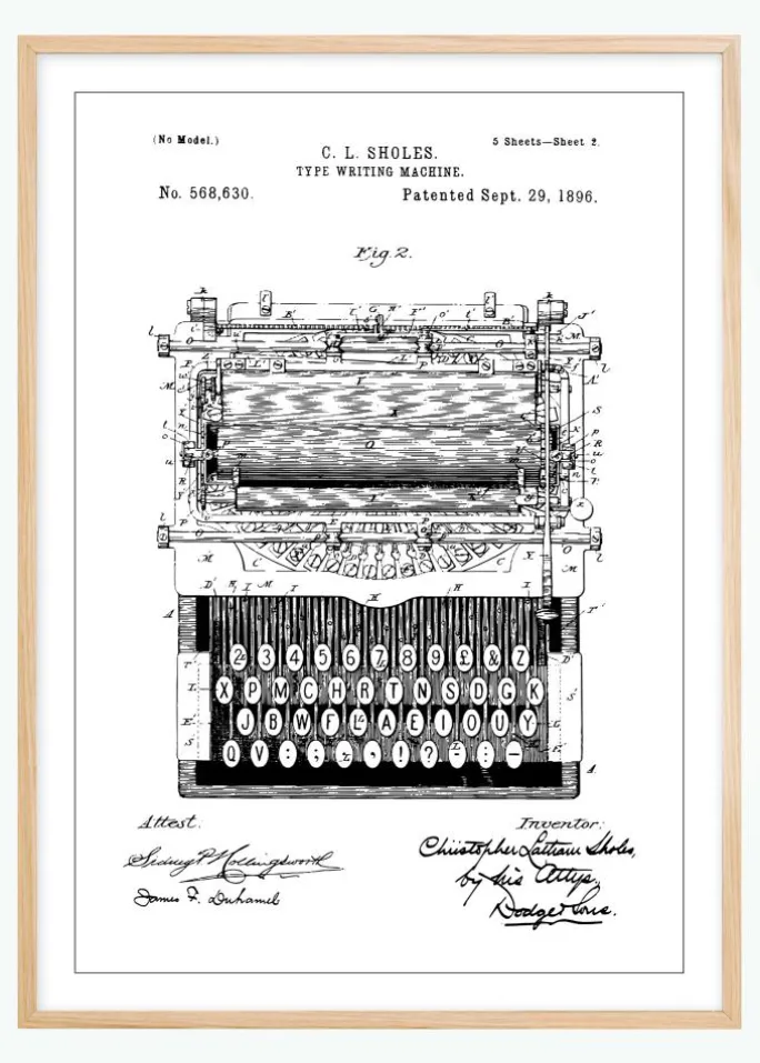FIG. 2 viser en kompleks indre visning af skrivemaskinen, inklusive dens tastatur og mekaniske detaljer. Underskriften af opfinderen Sholes, sammen med de to vidners navneunderskrifter, tilføjer en autentisk og personlig dimension til denne patentplakat. Det er et fremragende samtaleemne for alle, der har interesse for teknologi og historie, og ville gøre sig fremragende på væggene i et kontor, bibliotek eller i en samlers rum.