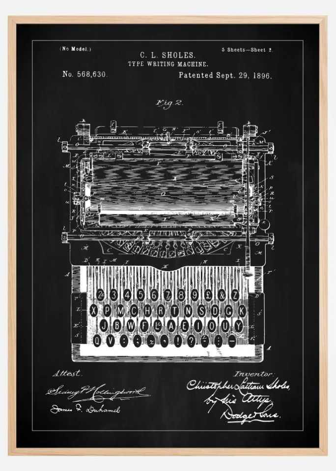 Denne ikoniske patentplakat afbilder det historiske patent nr. 568.630, udstedt den 29. september 1896 til C. L. Sholes for en skrivemaskine. Den imponerende illustration viser den mekaniske kompleksitet af en tidlig skrivemaskine, komplet med tastearrangement og indre mekanismer. Detaljer såsom den indviklede type mekanisme og det smukt arrangerede tastatur træder frem mod den dybsorte baggrund og giver en følelse af vintage-elegance.