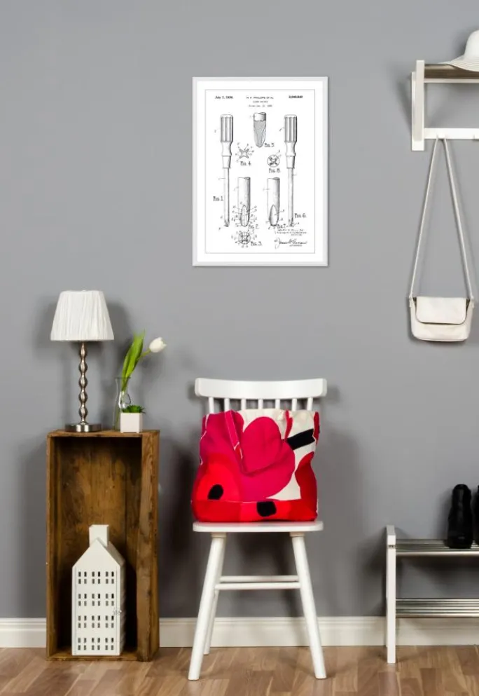 Denne patenttegning er mere end blot en instruktiv illustration, det er et stykke historie, en perfekt indretningsdetalje til værksteder, studierum eller som en sofistikeret vægdekoration. Elskere af både historisk håndværk og moderne design vil værdsætte denne plakat som både dekoration og inspiration. For at lette søgningen efter dette unikke objekt, bør søgeord såsom ‘skruetrækkerpatent’, ‘værktøjspatenttegning’, og ‘vintage patent plakat’ inkluderes for at fremhæve dets historiske og æstetiske værdi.