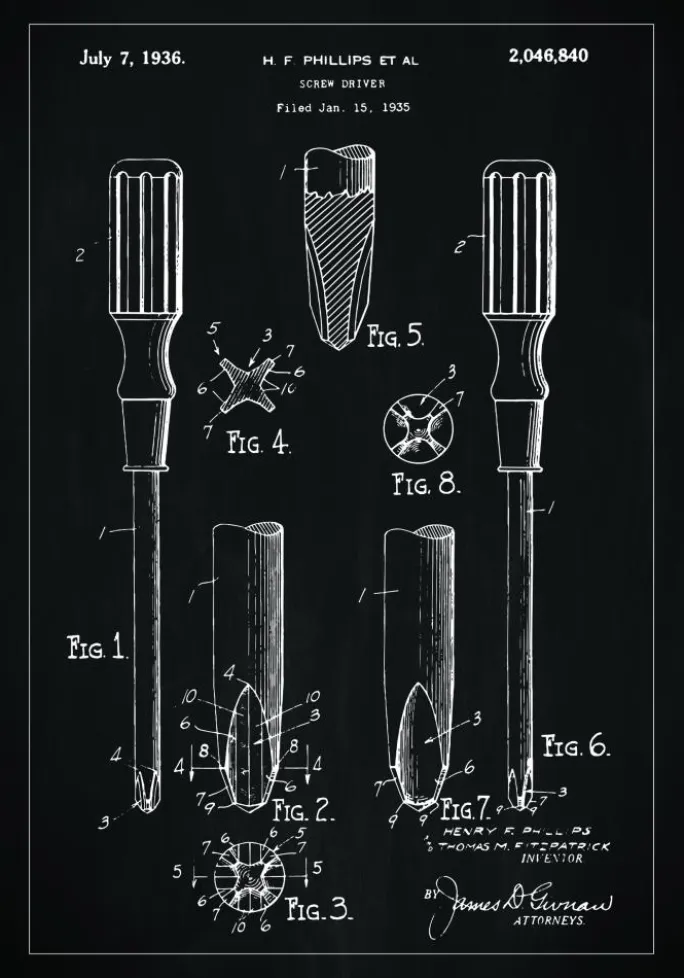 Denne patentplakat præsenterer det ikoniske værktøj, der revolutionerede monteringsarbejdet: skruetrækkeren, under patentnummer 2.046.840. Dateret 7. juli 1936 og opfundet af H. F. Phillips, viser denne detaljerede tegning et klassisk håndværktøjsdesign. Hver figur på billedet viser forskellige perspektiver og komponenter af skruetrækkeren, fra skaftet til spidsen, og demonstrerer den gennemarbejdede konstruktion.