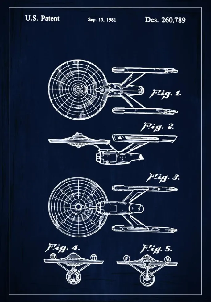 Denne patentplakat gengiver designen af rumfartøjet Enterprise fra Star Trek, med patentnummer Des. 260,789 dateret den 15. september 1981. Den detaljerede patenttegning er et eksempel på tidlig sci-fi-inspireret innovation, en vision om fremtidig udforskning af kosmos. Illustrationerne viser fartøjet fra forskellige vinkler og positioner, hvilket giver en dyb forståelse for dets unikke og komplekse struktur. Patentplakaten er et udtryk for menneskehedens stræben efter at nå stjernerne og en perfekt dekoration for alle, der drømmer om interstellære eventyr.