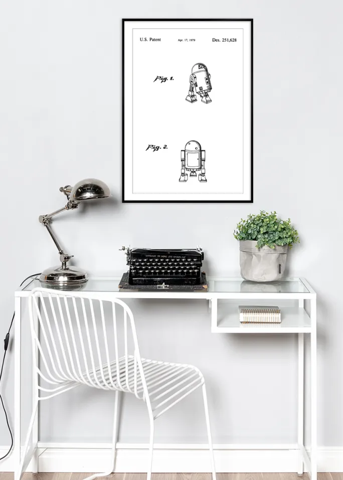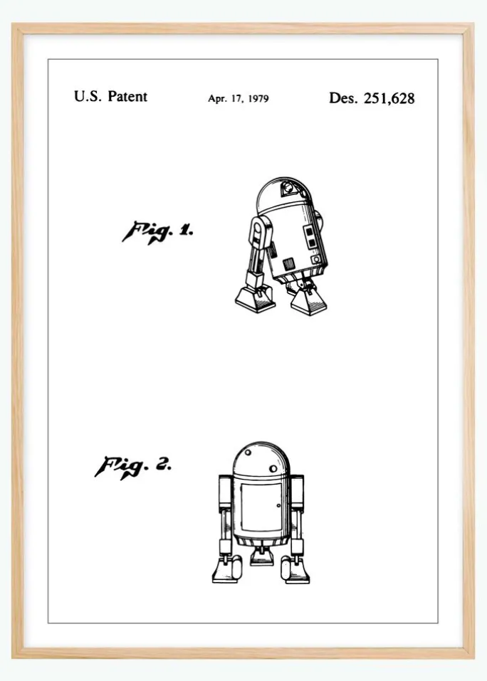 Denne fascinerende patentplakat fanger essensen af retrofuturisme med et design for en R2D2 fra StarWars, hvilket reflekterer periodens visionære blik mod fremtidens teknologi. Med et amerikansk patent dateret den 17. april 1979, under registreringsnummer Des. 251,628, illustrerer dette motiv to perspektiver af en ikonisk robotfigur, en fuld profil og en frontudsigt. Det er en tidløs patenttegning, der både er en hyldest til og en dokumentation af det sene 1900-tals fremskridt inden for robotteknologi og dets indflydelse i populærkulturen.