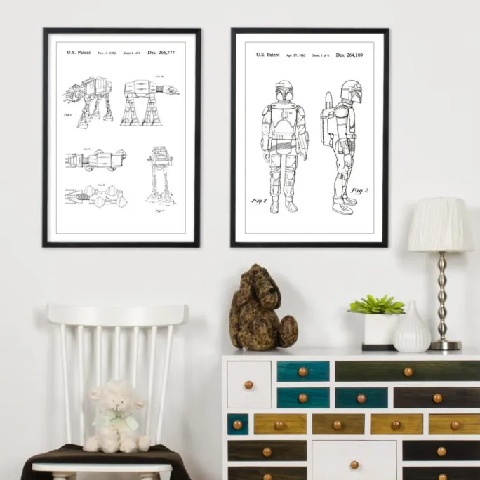 Denne elegante patentplakat er en kreativ gengivelse af designpatent Des. 266.777, registreret den 2. november 1982. Den viser nøjagtige stregtegninger af en ATAT fra Star Wars og giver hver betragter en dybere forståelse for kompleksiteten og præcisionen bag denne tekniske bedrift. Disse patenttegninger er ikke kun intellektuelt stimulerende, men også stilfulde kunstværker, der tilføjer en industriel charme til hvert rum.