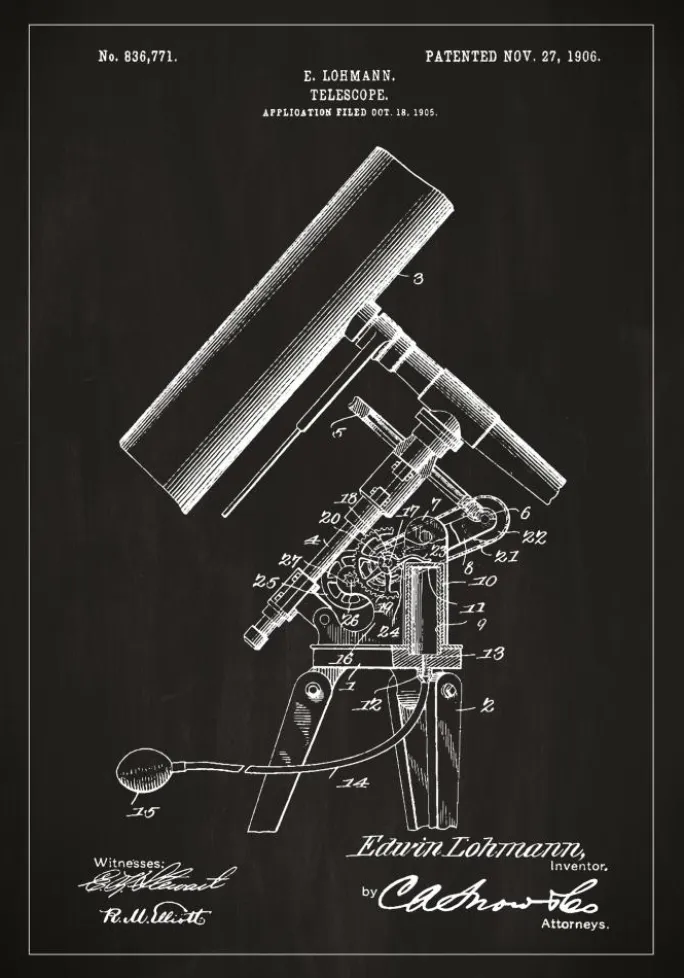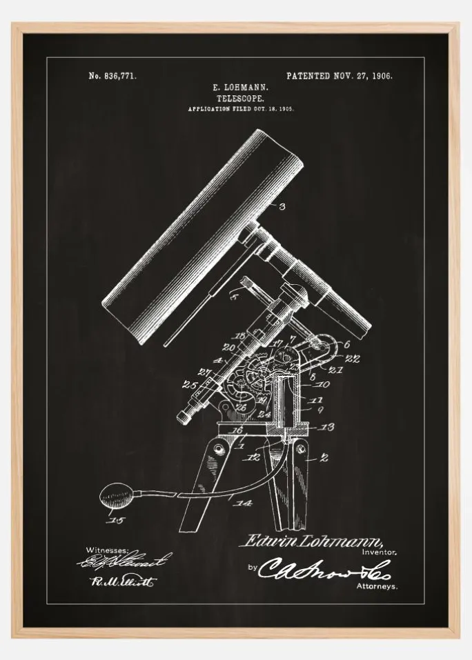 Denne detaljerede patentplakat fremstiller E. Lohmanns teleskop, patenteret den 27. november 1906, med patentnummer 836,771. Illustrationen fanger teleskopets komplekse mekanik og finmekaniske detaljer med omhyggelig præcision. Plakatens dristige kontrast mellem de indviklede linjer og den mørke baggrund gør den til en iøjnefaldende indretningsdetalje, der samtidig ærer astronomiens og optikkens rige historie. Det er en fascinerende hyldest til de videnskabelige fremskridt i begyndelsen af 1900-tallet og et inspirerende blikfang for alle videnskabsentusiaster.