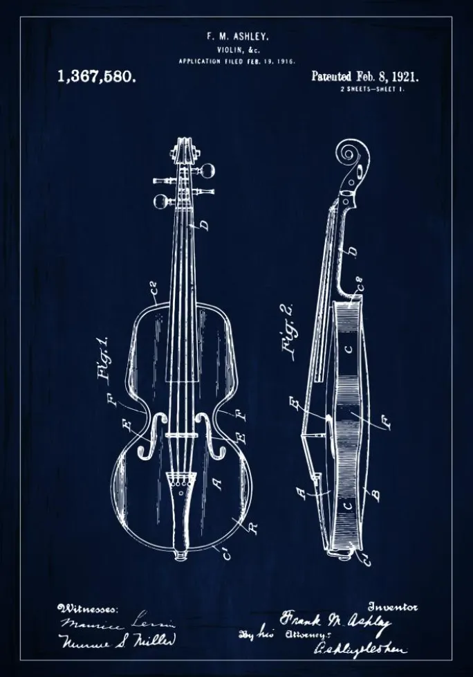 Dette dristige og distinkte patentplakat er en skildring af patent nummer 1.367.580, givet den 8. februar 1921 til F. M. Ashley for en violin, som præsenteres mod en sofistikeret marineblå baggrund. Med sine hvidlinjede illustrationer, der træder frem mod den mørke tone, tilbyder den en kontrast, der fanger øjet og fremhæver hver detalje af dette strengeinstrument, fra scrollen til strengeholderen.