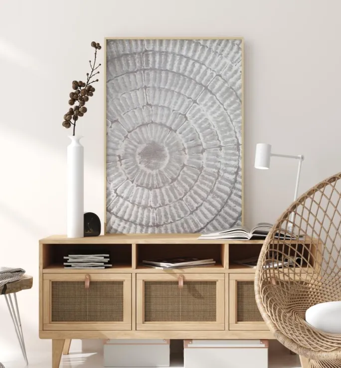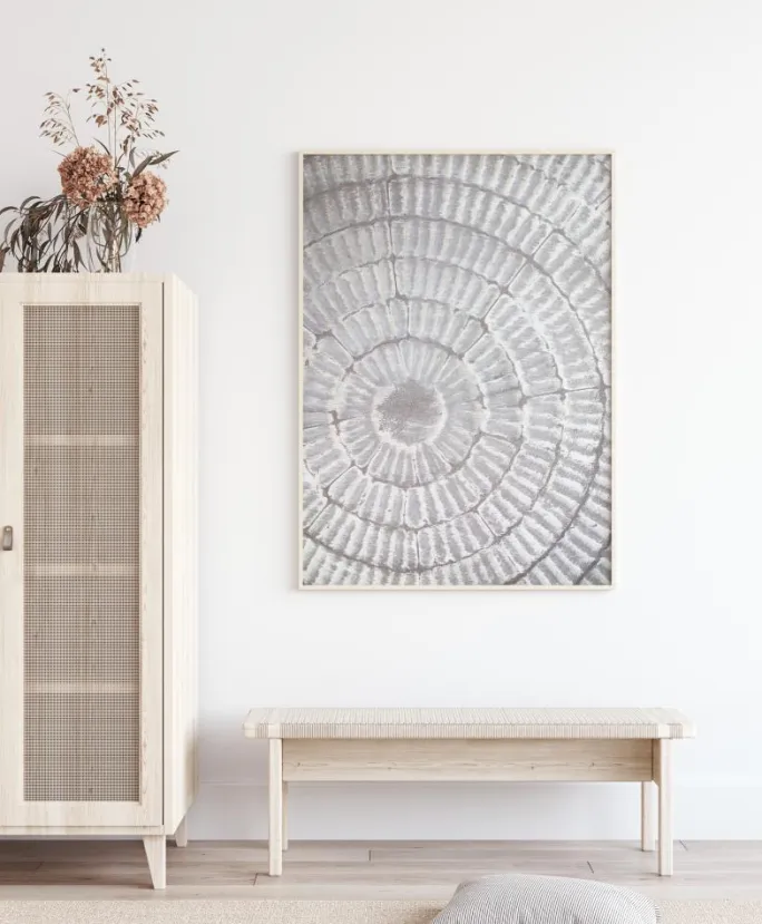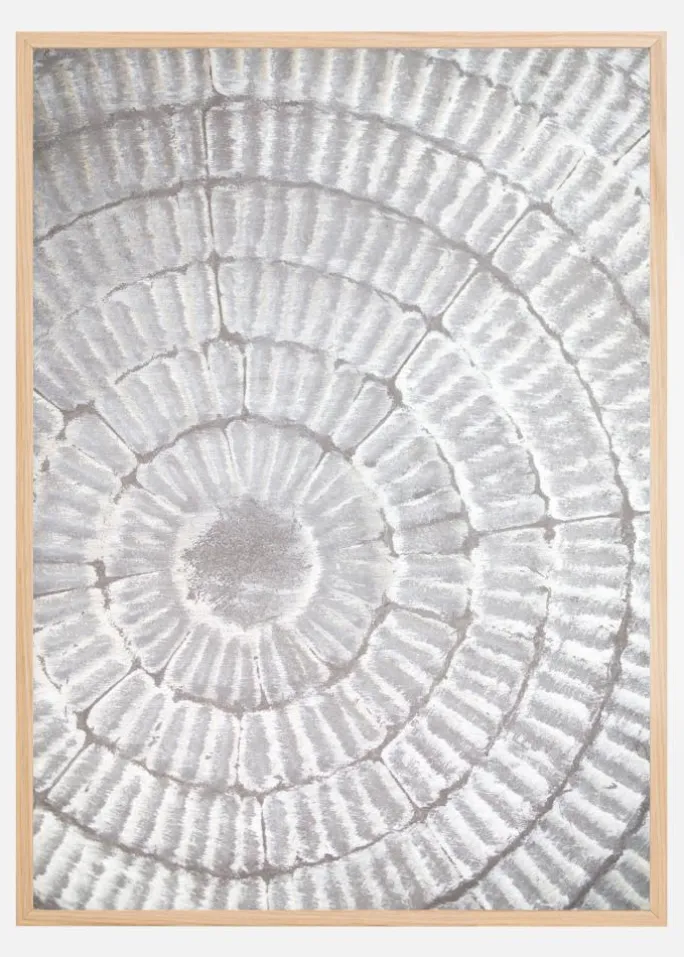 Et glasagtigt billede af en grå mønsterplade. De cirkulære beige og hvide ringe skaber et ribbet udseende på tallerkenen, der danner en perfekt glat cirkel i midten. Med sine bløde beroligende farver skaber dette dejlige print mystisk og alligevel fredfyldt. Ideel til en farverig væg.