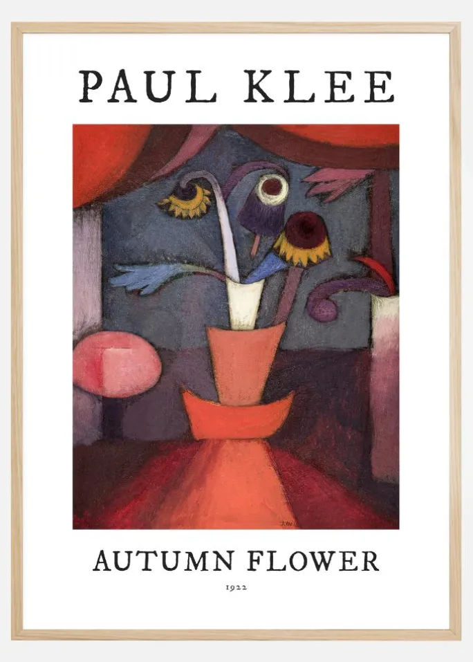 Denne kunstneriske plakat hylder Paul Klees “Autumn Flower” fra 1922, et værk der skildrer efterårets rige og dybe farver. I centrum står en vase med abstrakt formede blomster, strålende i nuancer af lilla, rød og guld mod en subtilt nuanceret baggrund. Denne kunsttryks legende kombination af varme og kølige toner samt dens komposition af geometriske og organiske former gør det til en ikonisk repræsentation af Klees banebrydende stil.