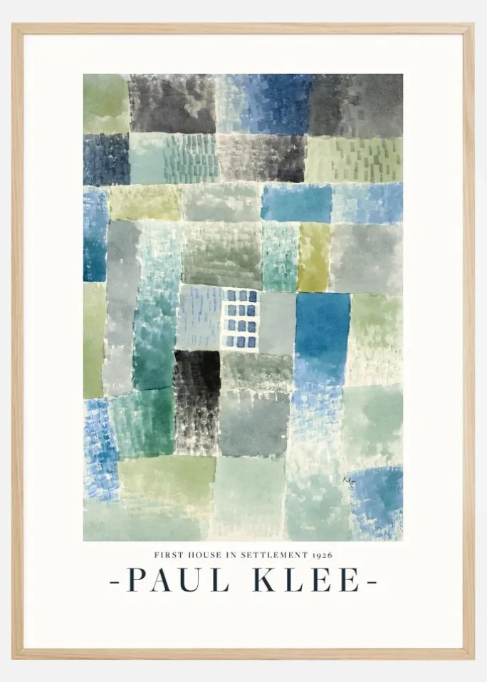 Denne levende plakat af Paul Klees “First House in a Settlement” fra 1926 er en mosaik af farve og form, der flettes sammen til en bedårende byudsigt. De mangesidede kvadrater og rektangler skaber en abstrakt landlig atmosfære i kølige og varme toner af blå, grøn og grå, hvilket fremkalder følelsen af en lille by i ro og mag. Klee leger med perspektivet, hvor visse blokke forekommer at være i forgrunden og andre i baggrunden, hvilket tillader øjet at vandre gennem kunstværkets skiftende landskab.