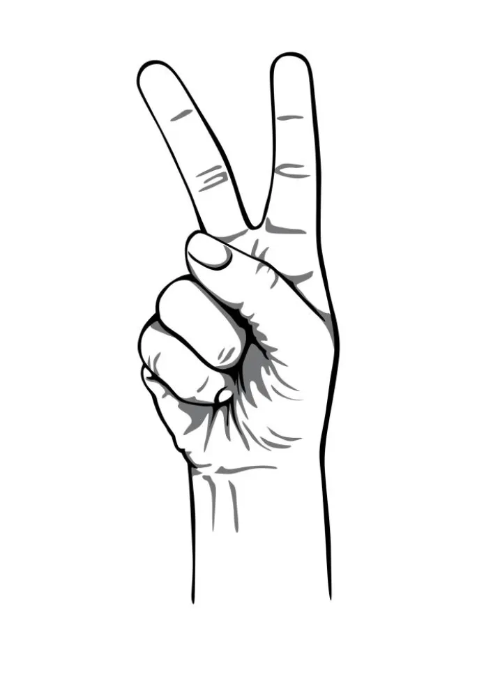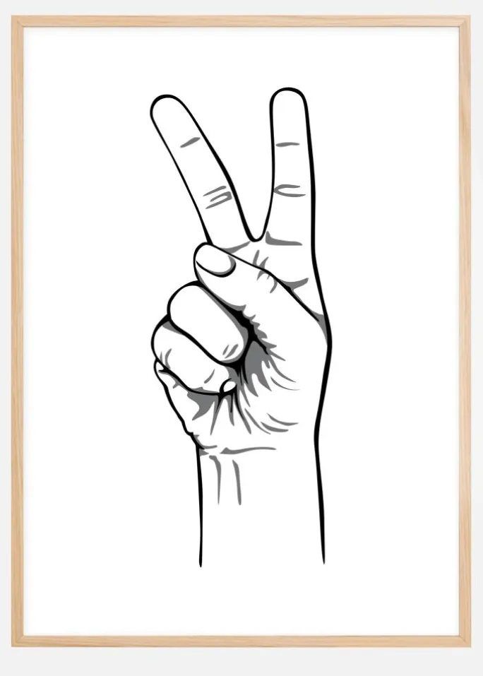 Et sort-hvidt print af en hånd, der repræsenterer fredstegnet. Tegnet på en hvid overflade er pegefingeren og langfingeren løftet, mens de andre holdes nede af tommelfingeren. Det perfekte print til at formidle og fremme et budskab om fred.