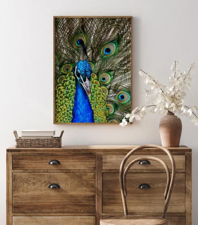 Et fantastisk nærbillede af en påfugl i nærbillede. Med sine store farverige halefjer med øjenlignende mønstre skinner dette flamboyante væsen i det naturlige sollys. Bring denne fugls skønhed ind i dit hjem. Et perfekt print til at lyse op på enhver bar væg.