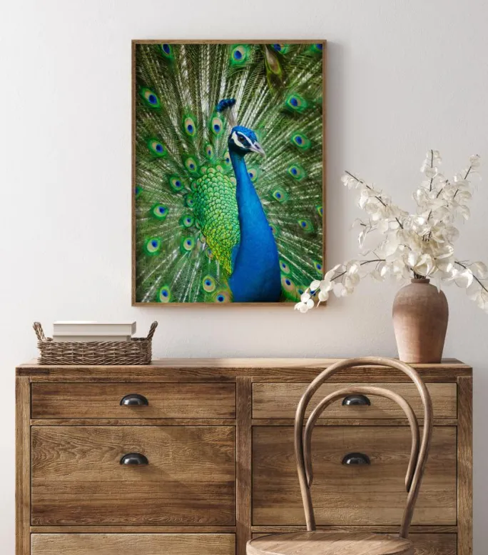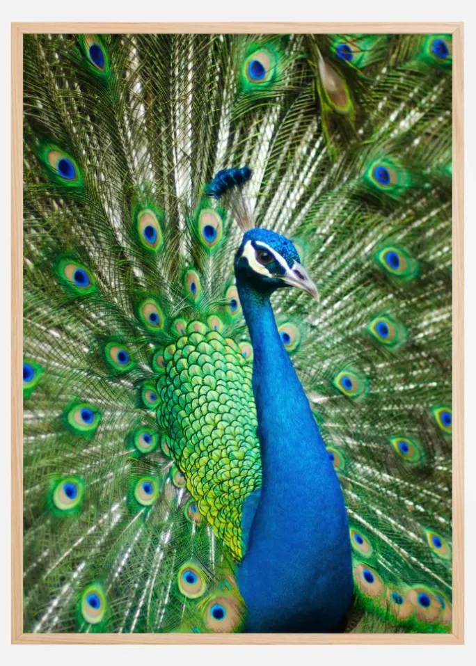 Et betagende billede af en storslået han-påfugl, der viser sin fantastiske hale frem. Med sine blå og grønne farver dominerende, viser denne smukke skabning stolt sit lyseblå bryst frem. Beundr de klare farver hos denne fugl, når du hænger dette print op i din vinterhave.