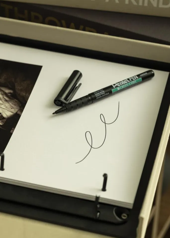 Her får du en sort pen fra Pentel, der fungerer godt til alle underlag. Pennen har en spids med en bredde på 0,8 mm.