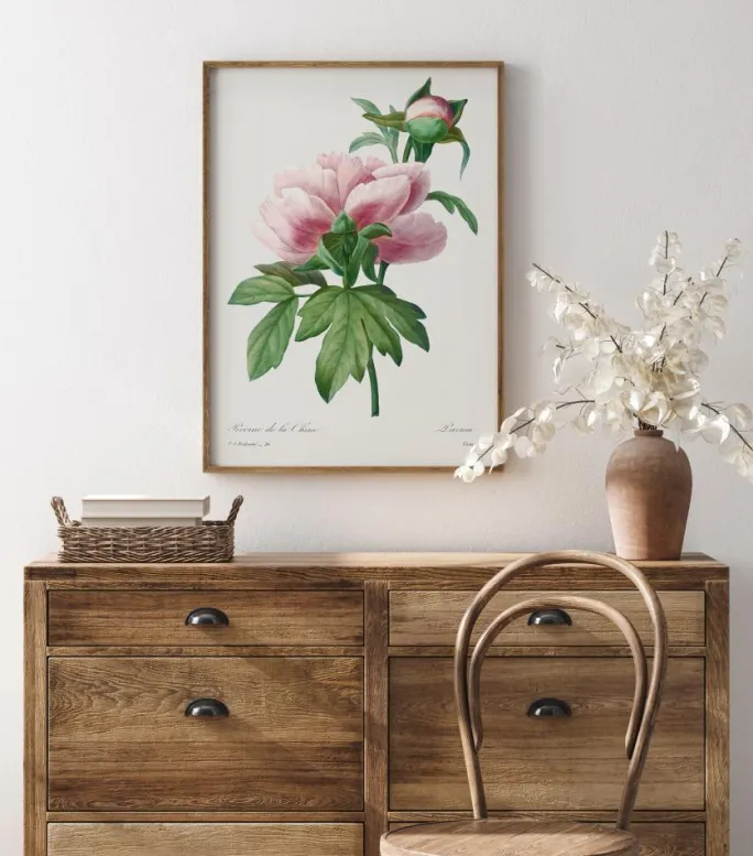 Et kunstnerisk indtryk af en pæonestamme med en lyserød blomst. På en beigefarvet baggrund er den lyserøde blomst placeret på en ferskenfarvet form, mens bladene er skitseret i sort. Bring denne blomsts delikatesse ind i dit hjem.