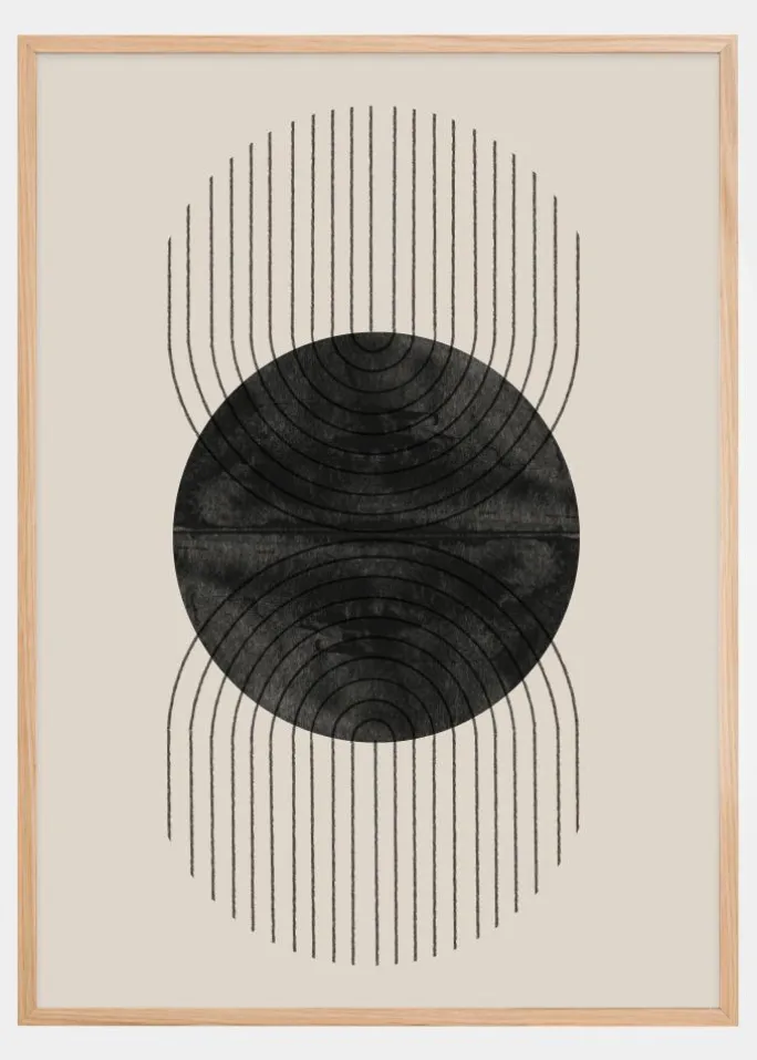 Denne stilfulde og konceptuelle plakat præsenterer en dyb sort cirkelform, som er centralt placeret blandt en struktur af fine linjer, der giver et indtryk af vibration og bevægelse. Den sorte cirkel, som er tekstureret og nuanceret, virker næsten flydende, og de sorte linjer bryder gennem cirklens form, hvilket skaber en følelse af tredimensionel dybde og perspektiv mod den lyse baggrund.