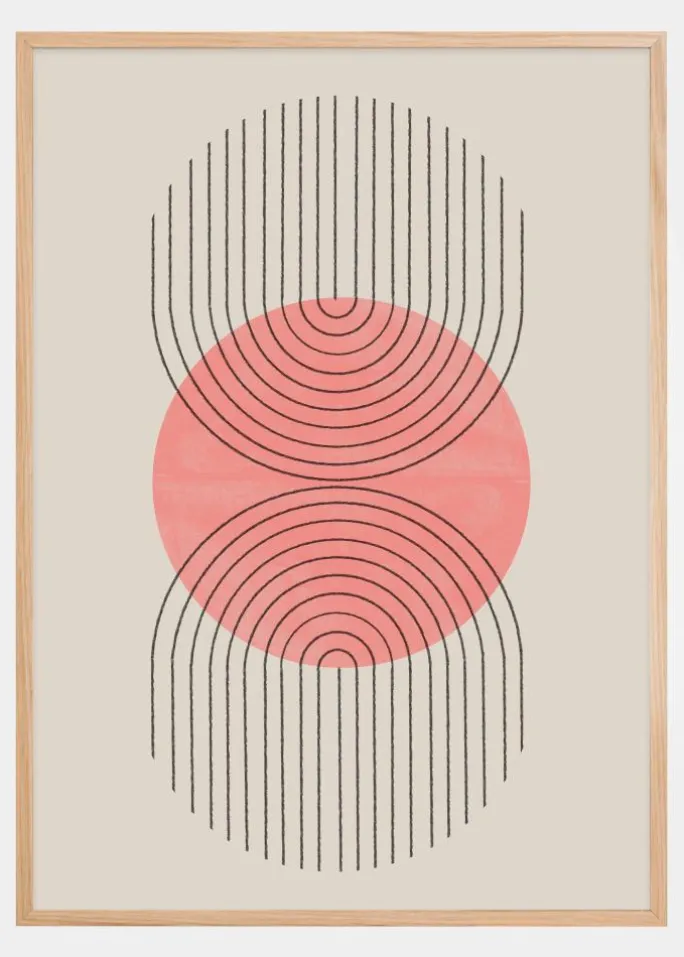 Denne nutidige plakat kombinerer enkelheden af geometrisk form med en blød, tiltalende ferskenfarvet tone. En central cirkel med koncentriske ringe, der minder om en rolig vandoverflade, er omgivet af et felt af vertikale sorte linjer, der synes at pulserende udad. Denne kontrast mellem den runde form og de rette linjer skaber en interessant dynamik og en følelse af bevægelse i kunstværket.