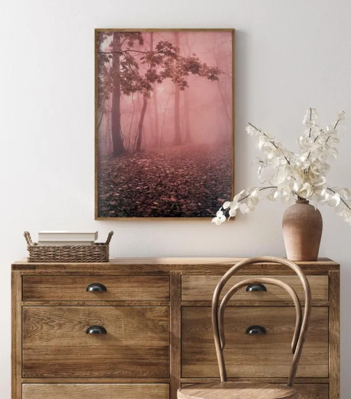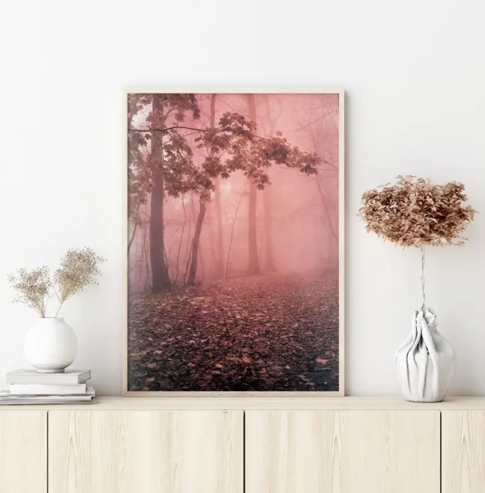 Et fantastisk og beroligende print af en lyserød skov om efteråret. Med efterårsbladene på jorden skaber den smukke tåge en mystisk, men fredfyldt atmosfære i skoven. Et dejligt print til at varme dit kolde rum på vinteraftener.
