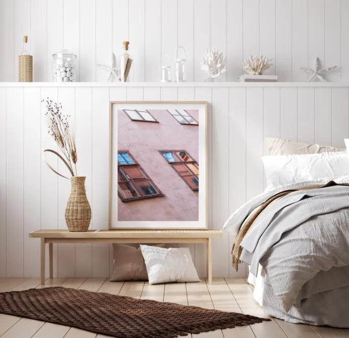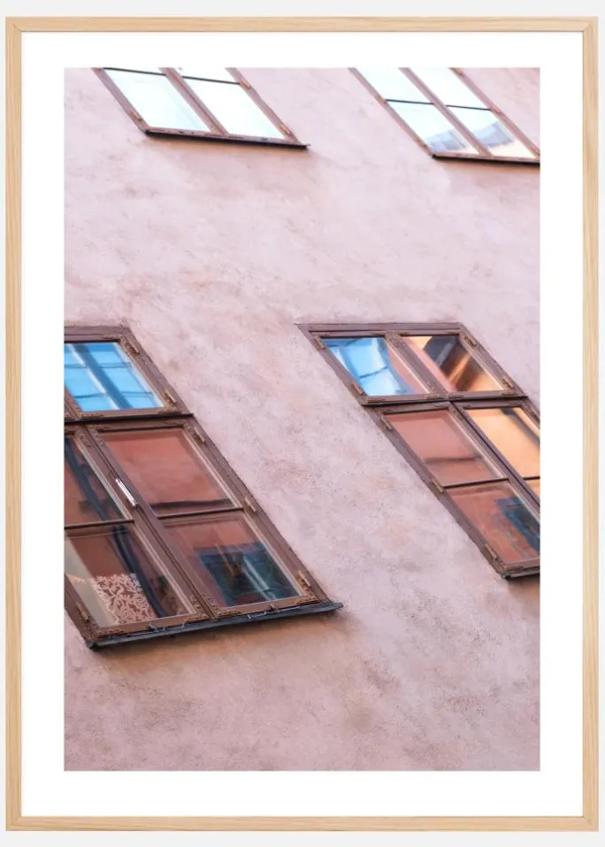 En fotografisk plakat af en facade i kontrasterende toner af brun og rosa. Et enkelt og hyggeligt motiv, der er indrammet af en lidt bredere passepartout i hvidt. Passer til de fleste hjem og indretningsstile.