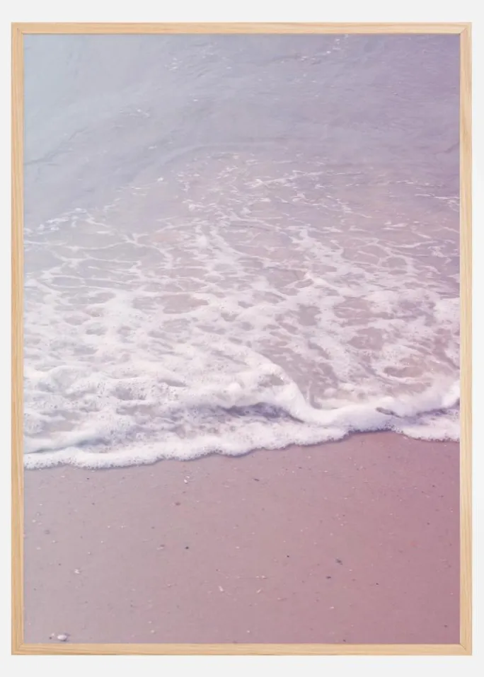 Et fantastisk portræt af havets kyst. Når bølgerne brydes på stranden, dannes der et hvidt skum på sandet. Det smukke lyserøde sand og havet skaber en sommerlig atmosfære. Bring sommeren ind i dit hjem med dette forfriskende print.