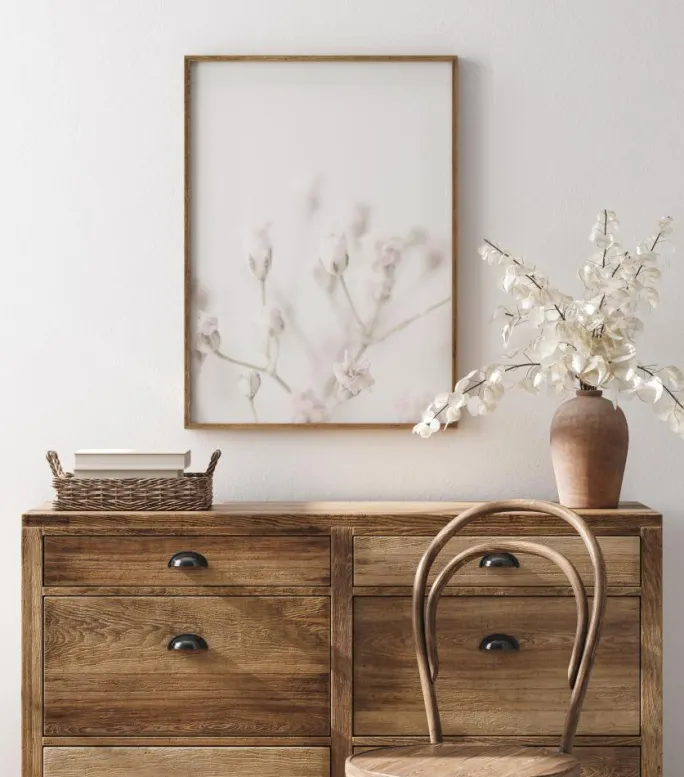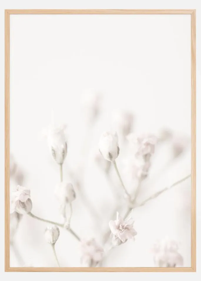 Et bedårende nærbillede af små lyserøde blomster, der står stærkt i det hvide snefald. Med en sløret hvid baggrund kan man kun svagt se blomsterne takket være deres bløde lyserøde kronblade. Bring vinterlandskabet ind i dit hjem med dette fantastiske print.