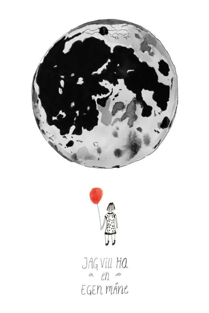 Et simpelt sort-hvidt print af en lille pige, der står under verden. Hun er klædt i en sort og hvidplettet kjole og holder en orange ballon. Jeg vil have min egen måne er det budskab, hun ønsker at formidle. Et perfekt print til at hænge på ethvert børneværelse.