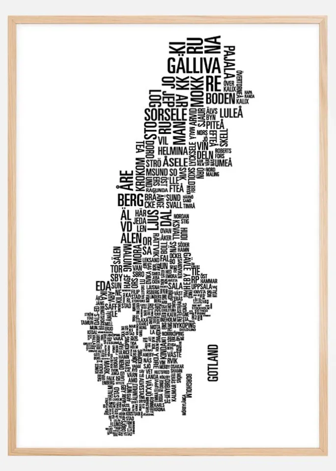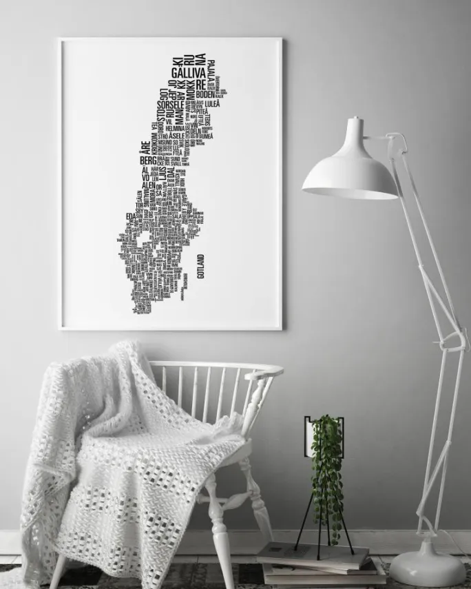 Lær navnene på alle Sveriges kommuner med hjælp af dette kreative Sverigekort! Den sort-hvide plakat fremstiller et kort over Sverige, der udelukkende består af tekst. Teksten skitserer på en virkelig flot måde, hvor i landet de forskellige kommuner befinder sig.