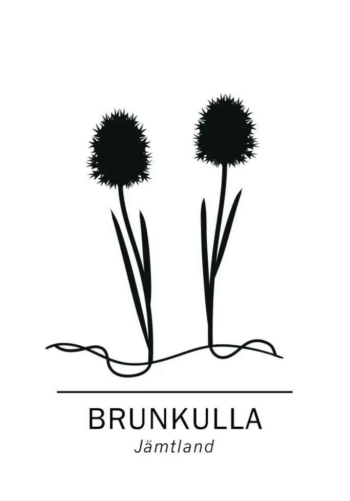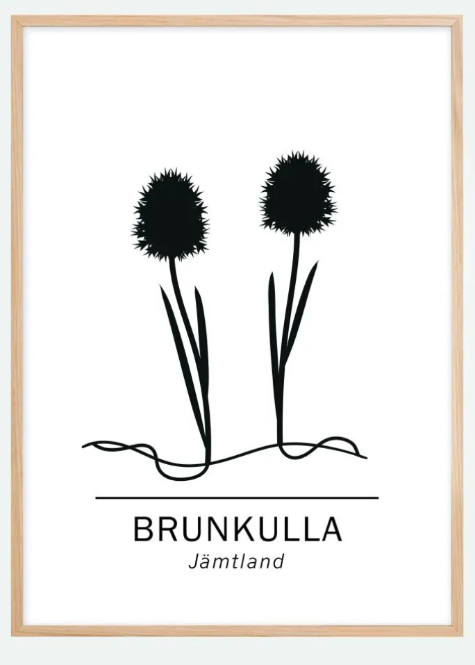 En enkel plakat med to sjældne sorte brunkulla-orkidéer på en hvid baggrund. Ordene Brunkulla Jamtland står under de enkle orkideer i print-stil i dette minimalistiske billede. Sæt den sammen med en lys farve efter eget valg for at få de kraftige tidsler til at springe endnu mere ud af værket.