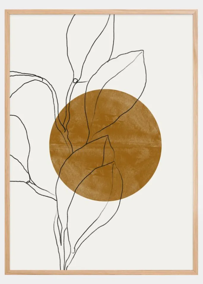 Udforsk skønheden i naturens enkelhed med vores unikke plakat, der viser en stiliseret plante mod en rund, sol-lignende baggrund. Denne tryk er designet til at fange øjet og skabe en følelse af ro og harmoni i dit hjem eller kontor. I motivet domineres farvepaletten af en rig, varm okkerfarvet cirkel, der minder om en solnedgangs blide glød, kontrasteret mod sorte, tynde linjer, der illustrerer blade og stilke i en minimalistisk men udtryksfuld skitse.