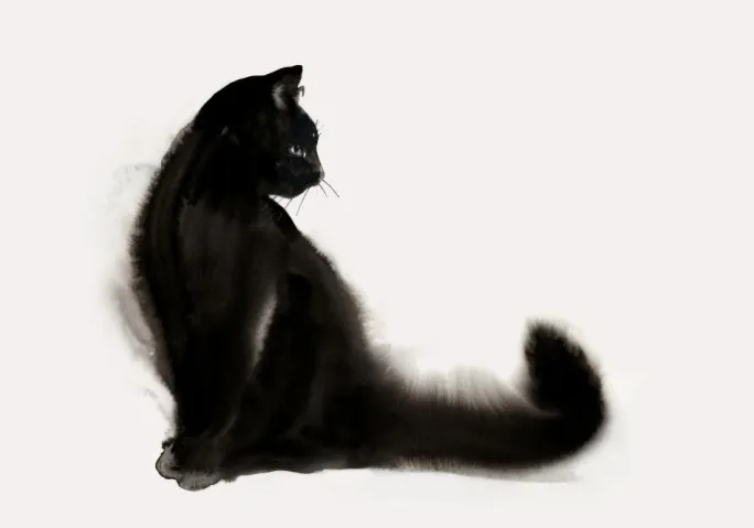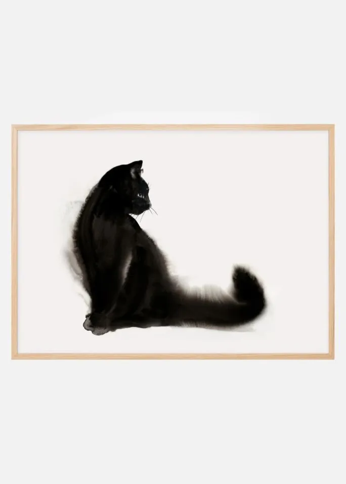 Et smukt print af en sort burmesisk kat. På en hvid baggrund kigger den sorte kat over skuldrene, som om den observerer noget. Det naturlige lys skinner på kattens forben og skaber en hvid plet. Et fantastisk billede for katteelskere.