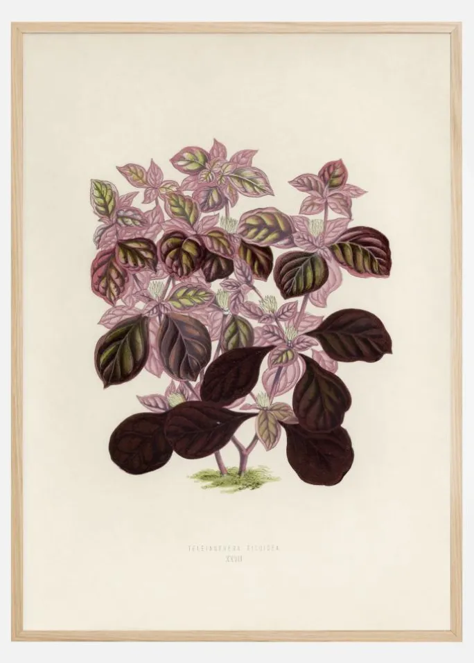 Et smukt håndaftryk af to lyserøde plectranthus scutellarioides. Den bløde beigefarvede baggrund fremhæver de smukke nuancer af rosa og grønt. Mod roden af planten skaber de bordeauxrøde farver en fornemmelse af vort på aftrykket. Tilføj dette print til din kunstsamling derhjemme.