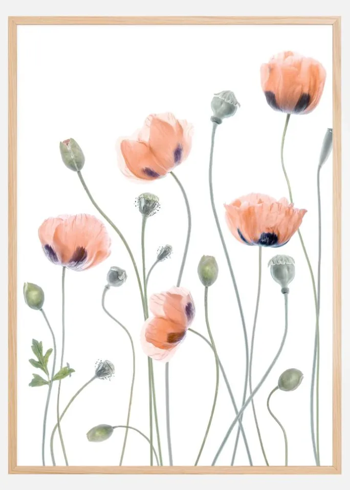 Et dejligt print af valmuer, der fletter sig sammen med tørrede græsser. På en hvid baggrund passer de ferskenfarvede valmuer perfekt sammen med de lysegrønne græsser. Hver valmue står i en anden højde. Et smukt beroligende print til at hænge i et landkøkken.