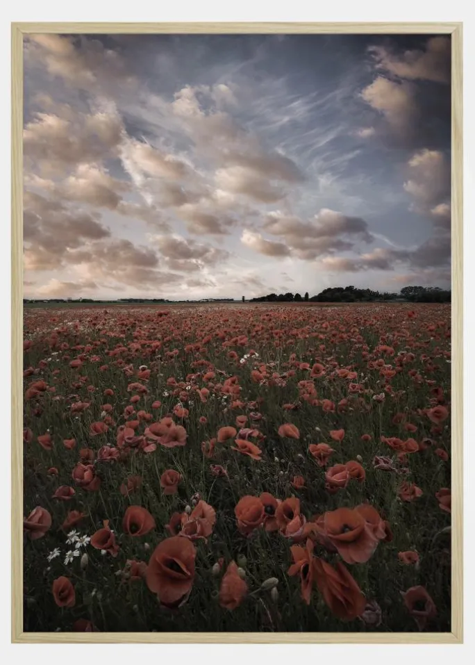 Et fantastisk rødt print af en valmueplads. Den skyede røde himmel fremhæver de smukke røde valmuer og hvide tusindfryd, der vokser vildt på den åbne mark. Den blide vind fejer hen over himlen og blæser valmuebladene. Et helt fantastisk print til at hænge i dit hjem.
