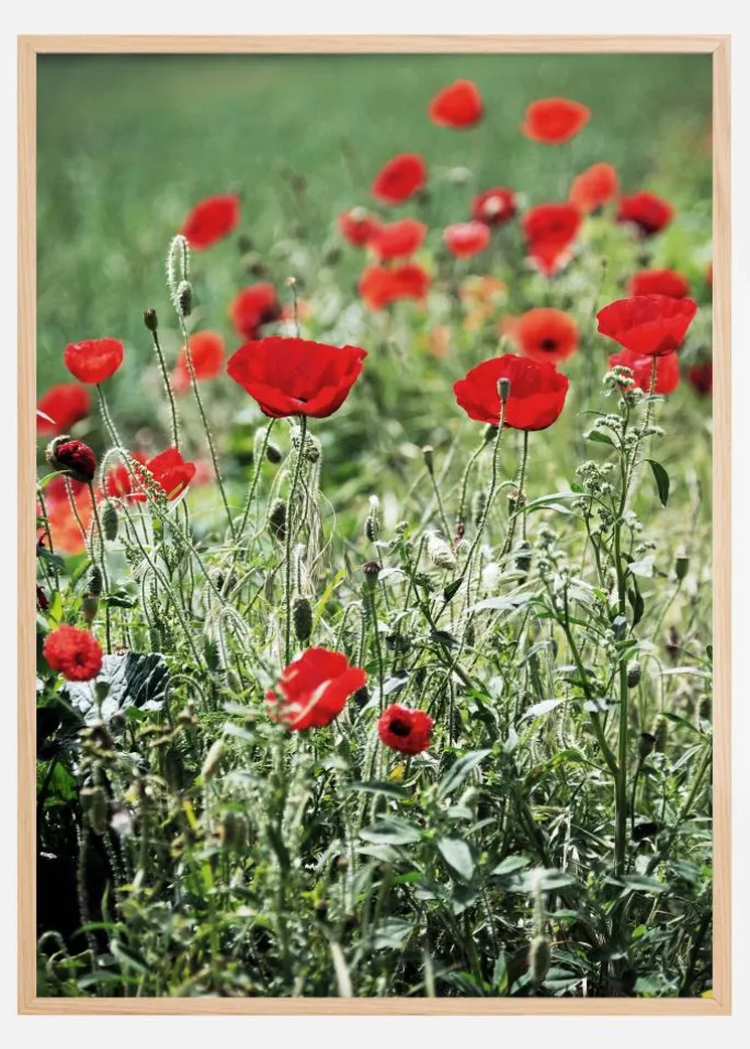 Et smukt nærbillede af en valmueplads. Det mørkegrønne græs fremhæver valmuerne og skaber en frisk følelse. Valmuerne står højt på marken, mens græsset vokser bredt. Et afslappende og dejligt print til at hænge i dit soveværelse.