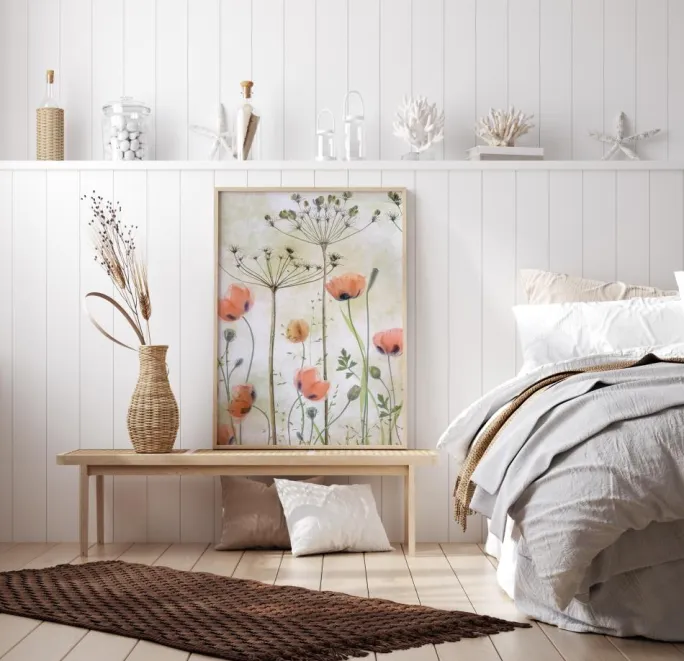 Et dejligt kunstværk med røde valmuer og tørrede græsser. De danser frit i vinden, og den beige himmel fremhæver naturens bløde røde og grønne farver. Høje græsser står højt i forgrunden med mindre græsser, der snor sig yndefuldt ind i hinanden. Et smukt print til at hænge i dit hjem.