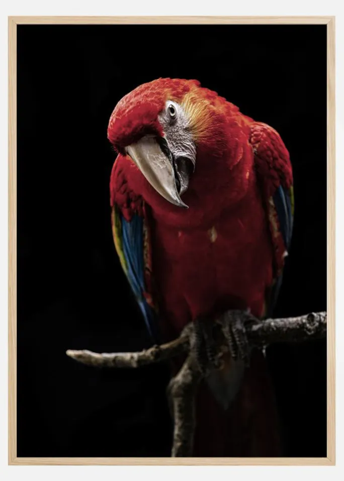 Denne livfulde plakat fanger den storslåede skønhed hos en rød ara i et øjebliksbillede af vild og utæmmet elegance. Med dens rige, dybe røde fjer, der flammer i kontrast mod en sofistikeret sort baggrund, er denne print et udtryk for naturens levende kunst. Skiftende nuancer af blåt og gult sniger sig ind på fuglens vinger og ryg, hvilket sikrer en spektakulær palette, der fanger betragterens blik og liver op i ethvert rum.