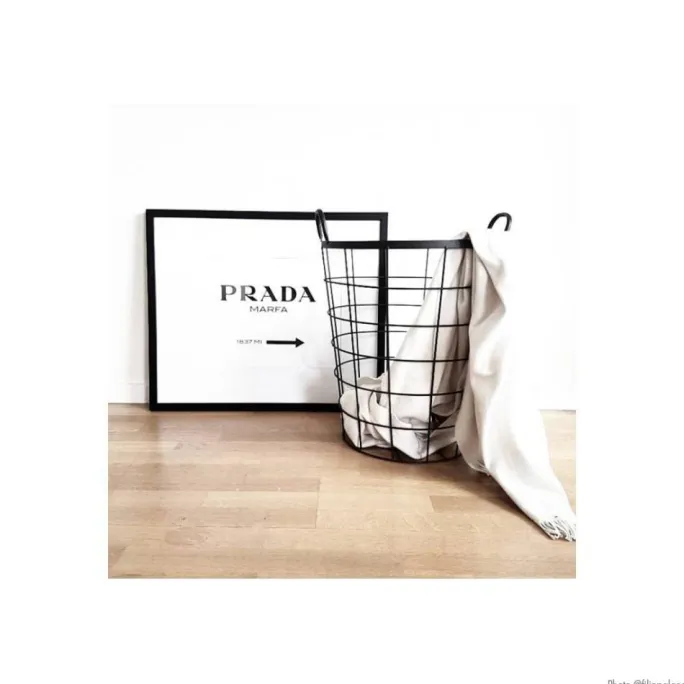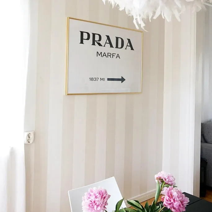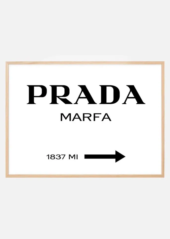 Plakat med en vejviser til det permanente kunstværk Prada Marfa, skabt af kunstnerne Elmgreen og Dragset. Installationen blev indviet den første oktober 2005 og skal ligne en Pradabutik. Det sort-hvide posters passer lige så godt hjemme hos kunstvennen som hos den, der kan lide modeverdenen, og kan med fordel hænges sammen med andre prints med grafiske motiver. Kompletter med en enkel sort eller hvid fotoramme, der lader teksten tale og som passer ind i de fleste miljøer.
