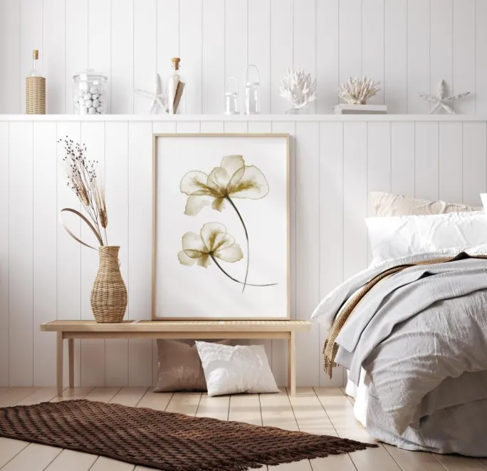 En enkel, men elegant plakat med to hvide blomster på en hvid baggrund. Mod bunden af printet overlapper blomsterstænglerne smukt hinanden, hvilket giver printet et delikat touch. Gennemsigtigheden af de bløde brune og beige toner ville se perfekt ud på en cremefarvet væg.