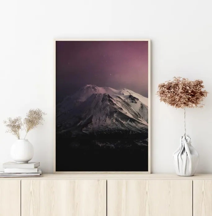 En stjerneklar natplakat af et massivt hvidt bjerg. Dette imponerende sneklædte bjerg ligger under en fantastisk lilla himmel. Den lilla himmel reflekterer på bjergtoppene og skaber en varm følelse på printet. Et smukt print til at hænge i et koldt miljø.