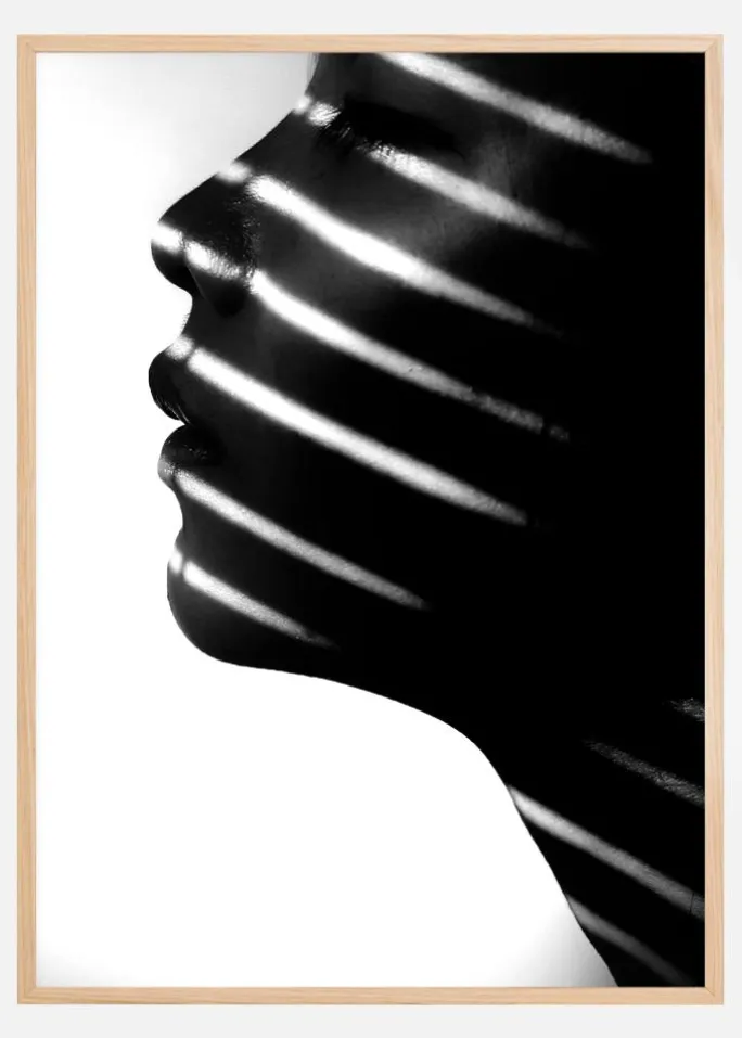 Et fantastisk portræt, der fanger lyset, der skinner på en kvindes ansigt og hals. På en hvid baggrund har kvinden lukkede øjne. Det naturlige lys, der stråler gennem skodderne, skaber en følelse af varme. Et perfekt print til at hænge i en skønhedssalon.