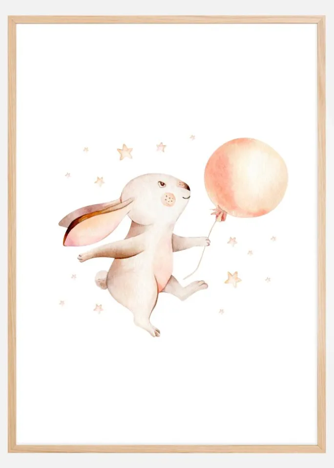 Denne bedårende plakat portrætterer en glad kanin svævende gennem luften ved hjælp af en stor, farvet ballon. Omgivet af små guldstjerner skaber denne drømmende akvarel en følelse af magi og frihed. Illustrationens lyse og varme toner fremkalder en følelse af leg og lykke, hvilket gør den perfekt for at sprede glæde i et børneværelse eller hvilket som helst hyggeligt hjørne i hjemmet.