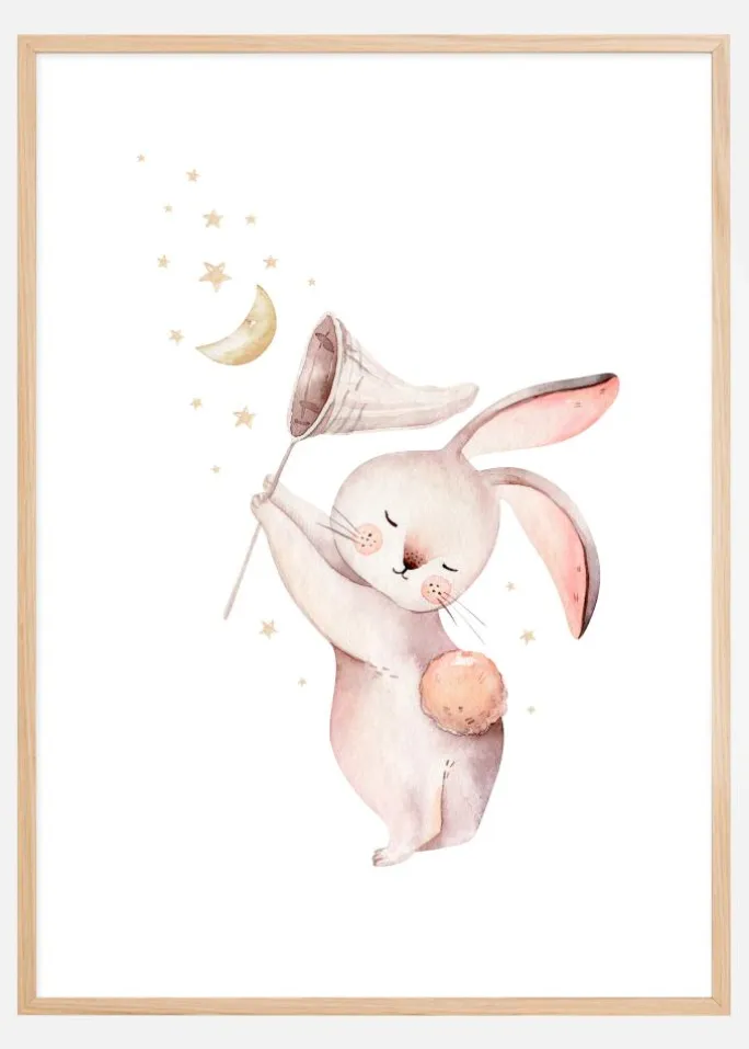 Denne drømmelignende plakat viser en bedårende kanin, der rækker efter månen med en blød følelse af eventyr og fantasi. Kaninen holder et fiskenet og ser ud til forsigtigt at fange guldstjernerne omkring den skinnende månesegle. Den lette akvarelpallet af pastelfarver fremhæver den rolige og magiske følelse, som motivet udstråler.