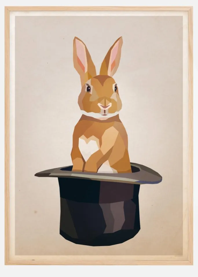 En enkel, men sjov plakat med en kanin i en tryllekunstnerhat. Med sin rolige rolighed stirrer den guldfarvede kanin lykkeligt mod beskueren. Kaninens farver passer perfekt ind i baggrunden på en beige baggrund. Dette smukke print vil forvandle dit barns soveværelse til et varmt og venligt miljø.