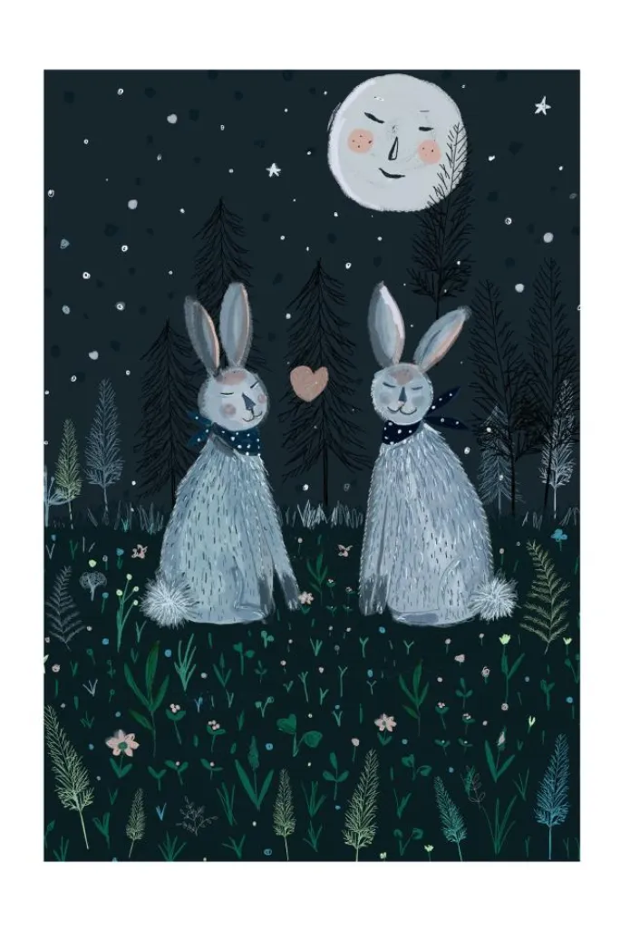Et sjovt portræt med månen og skovkaninerne i fast søvn. Stjernerne skinner klart, mens jordplanterne står køligt i aftenstemningen. Med hovedtørklæder bundet om kaninernes hals og et hjerte placeret mellem dem, er dette et perfekt print til alle forelskede.