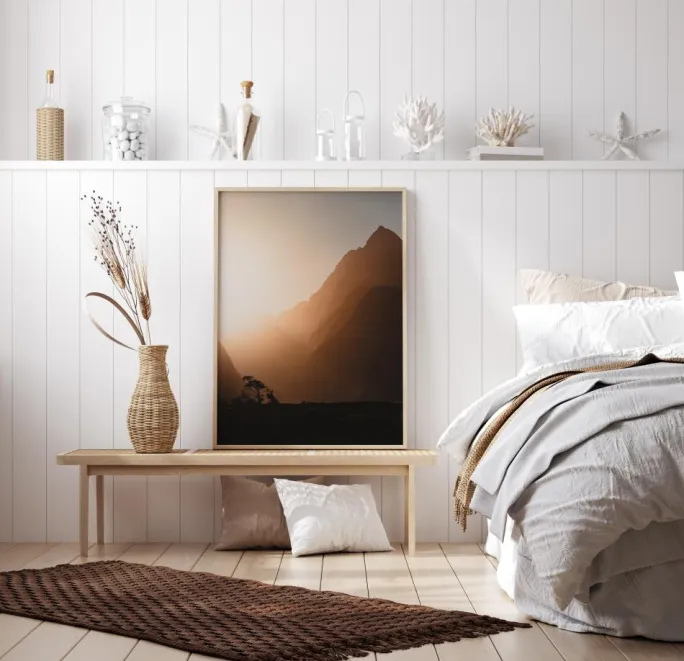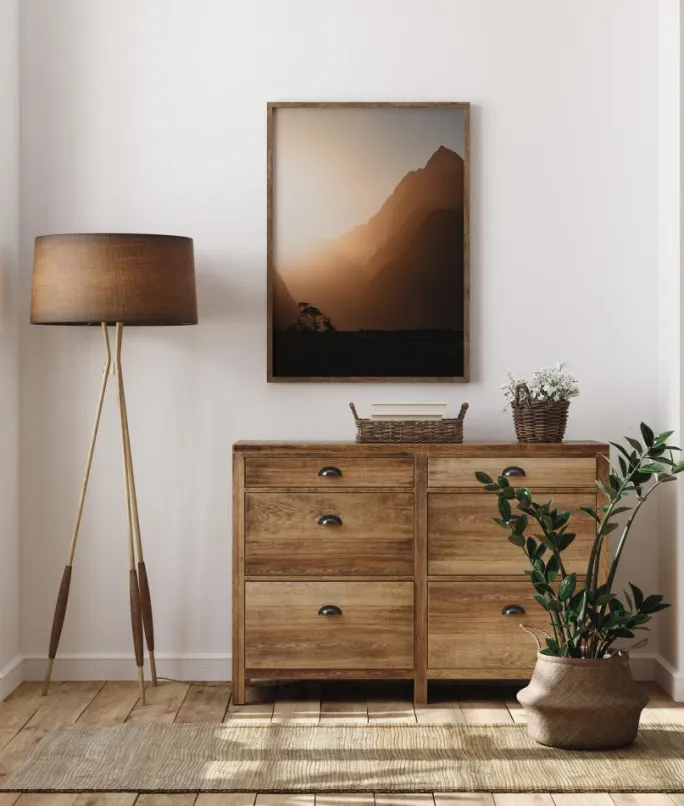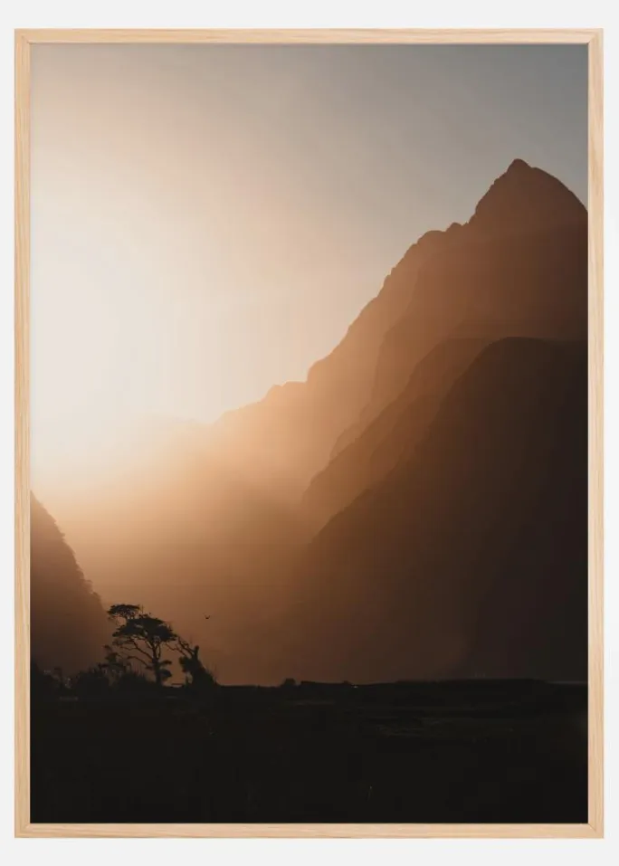 En smuk naturskøn plakat af et landskab ved solnedgang. Kløften mellem bakkerne skinner med lyse blændende stråler og skaber en mørk forgrund. De fjerne træer og fuglen manifesterer livets eksistens. Udsmyk dit soveværelse med denne livlige plakat.