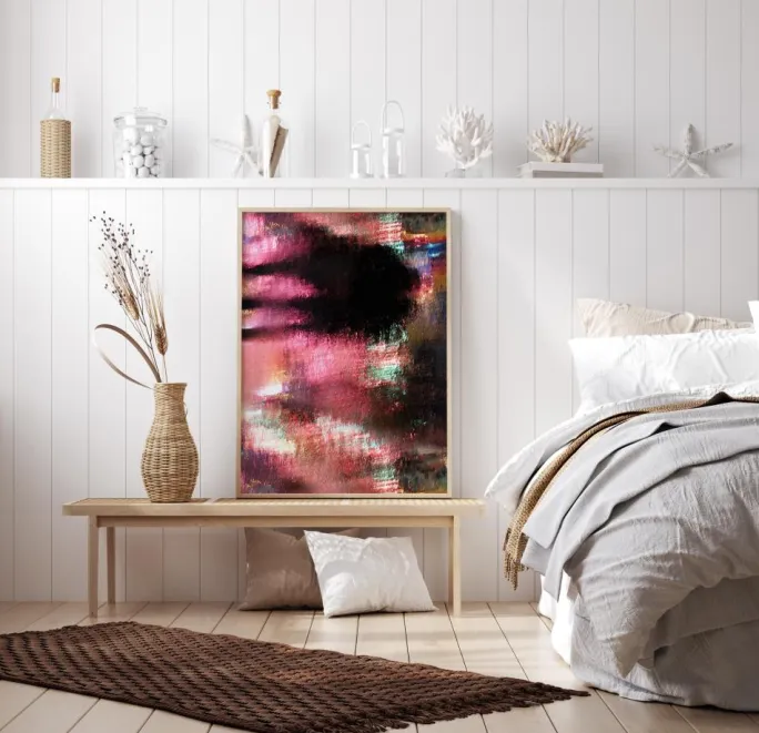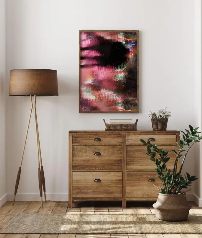 En perfekt blanding af farver med lyserøde toner dominerer dette flerfarvede print. Øverst på printet er der et sort område, der skaber en følelse af dybde. Til højre for det sorte område er der et lodret rør i form af røde og grønne farver. Et perfekt print til at tilføje et strejf af farve til en almindelig væg.