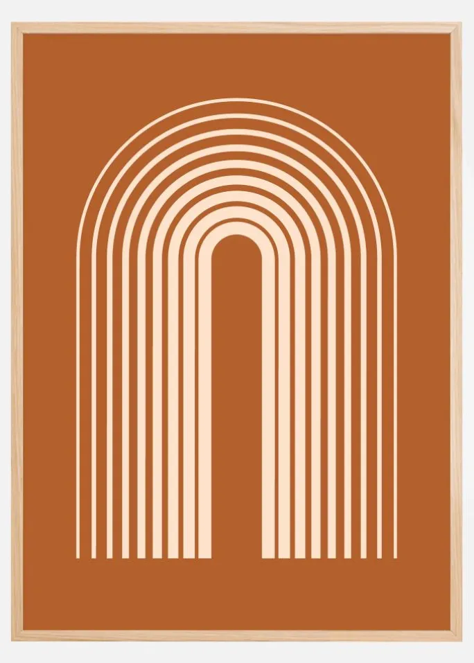 Denne plakat med et abstrakt halvbue-mønster er en hyldest til moderne kunst og design. Mønsteret fremstår som en serie af perfekt symmetriske buer i varme, tonale farver som giver et beroligende og rytmisk visuelt udtryk. Den stadigt mørkere terracotta-baggrund tilbyder et dybt og rigt landskab for de lysere linjer at fremstå fra, og skaber en dynamisk kontrast som fanger blikket.